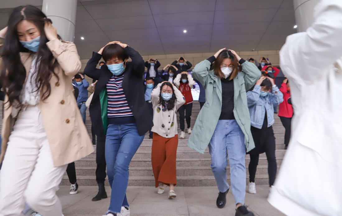 演練開(kāi)始后,當(dāng)聽(tīng)到地震緊急避險(xiǎn)警報(bào),集團(tuán)員工就近避險(xiǎn),迅速抱頭、閉眼,躲在桌子下,盡量蜷縮身體,降低身體重心,保護(hù)頭部。在聽(tīng)到緊急疏散警報(bào)后,全體員工在藍(lán)天救援隊(duì)的指揮下,雙手抱頭,或用文件夾、筆記本等物品遮擋保護(hù)頭部,快速有序的撤離辦公場(chǎng)所,到達(dá)指定避險(xiǎn)集結(jié)安全區(qū)域。